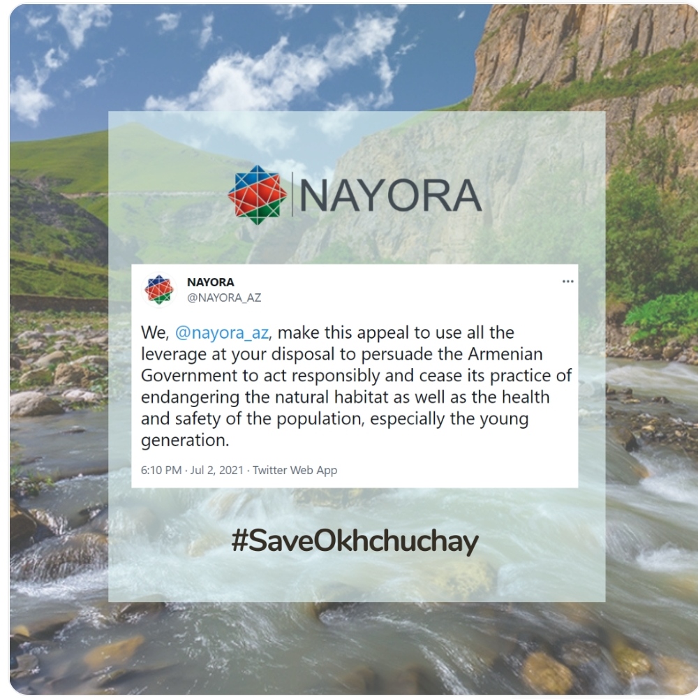 Azərbaycan Respublikası Gənclər Təşkilatları Milli Şurası ölkə ərazisindən keçən transsərhəd çaylardan biri olan Oxçuçayın Ermənistan tərəfindən çirkləndirilməsi ilə bağlı beynəlxalq təşkilatlara müraciət ünvanlayıb.