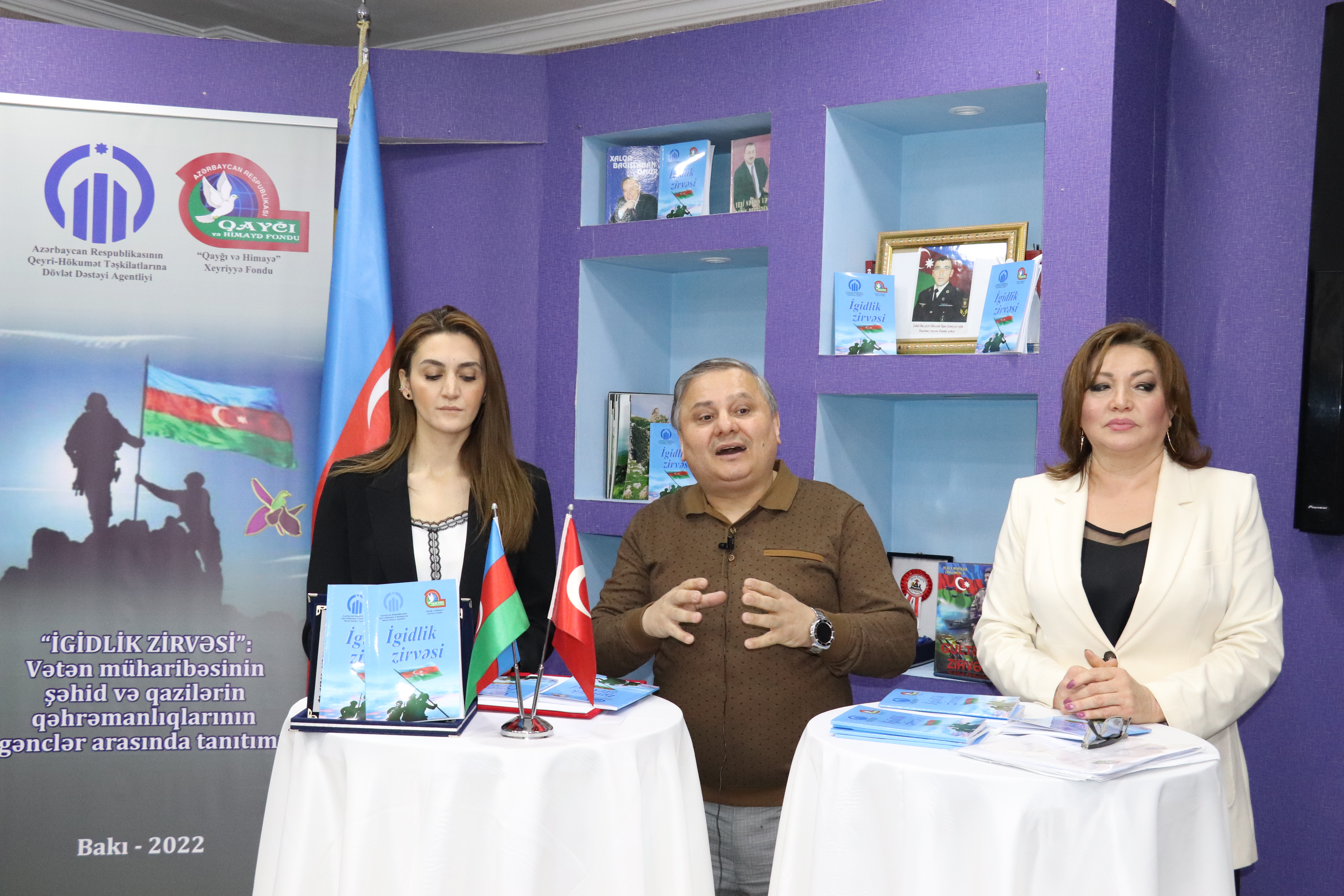 “Qayğı və Himayə” Xeyriyyə Fondunun və “İgidlik zirvəsi”: Vətən müharibəsinin şəhid və qazilərin qəhrəmanlıqlarının gənclər arasında tanıtımı” layihəsinin rəhbəri, tanınmış şairə-publisit Gülayə Rzayeva açıqlamasında bildirdi ki, maraqlı fəaliyyət növləri ilə qəhrəmanlıq tariximizi əbədiləşdirmək niyyətindədirlər. Natiq vurğuladı ki, layihə ənənəvi – klassik yazı və yeni vizual formaları sintez etməklə, gələcəyin əsgərləri sayılan məktəbli, tələbə, yeniyetmə və gənclər arasında hərbi-vətənpərvərlik, Vətən uğrunda canından keçmək kimi müqəddəs hissləri aşılayan, hər iki Qarabağ müharibəsində igidlik göstərənlərin qəhrəmanlıqlarını gələcək nəsillərə çatdırmağa yönəlib. Bu istiqamətdə ənənəvi və yeni metodlardan yararlanmaqla, şəhidlik və qazilik zirvəsinə qalxmışların, eləcə də Qalib Müzəffər Ordu və Ali Baş Komandanın bədii obrazlarını özündə birləşdirən əsərlərin kağız və elektron formada nəşri, tanıtımı, yayımı təşkil olunduğunu söyləyən fond rəhbəri bu fəaliyyətlərin müsbət tərəflərini sadaladı. O, qeyd etdi ki, paralel olaraq İnternet resurslarında yayımlanan vizual və virtual məhsullar, 4 onlayn TV veriliş, yeni mediada gedən virtual məhsullar, eləcə də sosial şəbəkələr, saytlar, İKT imkanlarından bəhrələnməklə, gənc nəslin qəbul etdiyi formatlara uyğun fəaliyyətlərlə tanıtım aksiyaları keçirilir. Öz çıxışının sonunda G.Rzayeva onu da xatırlatdı ki, təqdim olunan kitab və onun elektron variantı gənclər arasında yayımlanır, hazırlanan silsilə onlayn TV verilişlər, yeni media məhsulları vasitəsi ilə vətənpərvərlik təbliğ olunur.