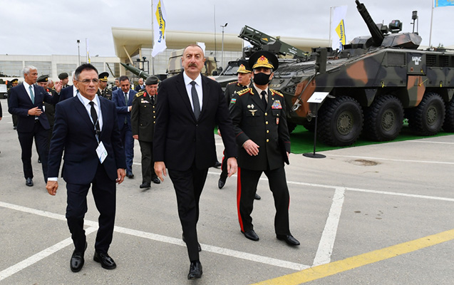 Prezident İlham Əliyev Azərbaycan Müdafiə Sənayesi Nazirliyinin pavilyonunda nümayiş etdirilən hərbi məmulatlara baxıb. Milli Təhlükəsizlik Qüvvələrinin ehtiyaclarını ödəmək üçün müdafiə təyinatlı məmulatların, döyüş sursatlarının, zirehli hərbi texnikanın və digər vasitələrin yaradılması, istehsalı, təkmilləşdirilməsi, təmiri, utilizasiyası, idxalı/ixracına və xarici bazarlarda satışına cavabdeh olan nazirliyin pavilyonlarında son illərdə ölkəmizdə istehsal olunan yüngül və ağır hərbi texnikalar nümayişə çıxarılıb. Döyüş kəşfiyyat texnikası, çoxməqsədli, kəşfiyyat və zərbə pilotsuz uçuş aparatları, müxtəlif çaplı atıcı silahlar, mühəndislik texnikaları və digər hərbi texnikalar sərginin maraq doğuran eksponatları sırasındadır.