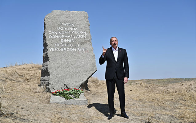 Şəhidlərimizin şərəfinə bu abidə – bu qaya parçası burada, Qaraxanbəyli kəndinin yaxınlığında ucaldılıb. Qaraxanbəyli kəndi və digər beş kənd İkinci Qarabağ müharibəsinin ilk günündə azad edilmişdir. Qaraxanbəyli, Qərvənd, kənd Horadiz, Yuxarı Əbdürrəhmanlı – Füzuli rayonunun kəndləri və Cəbrayıl rayonunun kəndləri – Böyük Mərcanlı və Nüzgar kəndi müharibənin ilk günündə azad edilmişdir. İlk şəhidləri biz məhz burada, bu yerdə vermişik. Bu abidənin yanında düşmənin səngəri yerləşirdi. Bu istiqamətdə beş-altı müdafiə xətti mövcud idi. Azərbaycan əsgəri, Azərbaycan zabiti bu müdafiə xəttini və bundan sonrakı müdafiə xətlərini yarmaq üçün ölümə gedirdi. Sözün əsl mənasında ölümə gedirdi, öz canını fəda edirdi ki, üçrəngli Bayrağımız Şuşada və o vaxt işğal altında olan digər bütün torpaqlarda dalğalansın. Öz canını fəda edirdi ki, Azərbaycan xalqı ləyaqətini bərpa etsin, ədaləti bərpa etsin və xalqımız öz torpaqlarına qayıtsın.